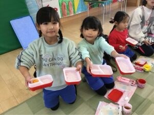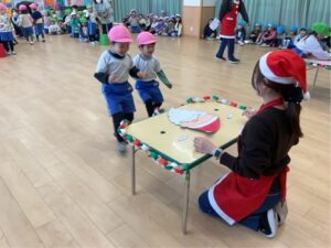 サンタさんが帰ったあとも、皆でサンタのふく笑いリレーをクラスごとに対決し、とても盛り上がりました!