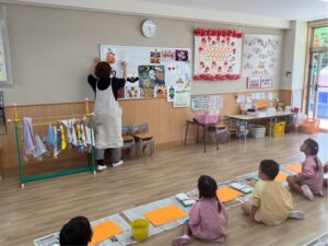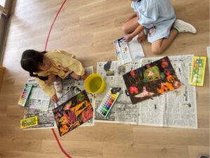 今日は絵画の日があり、年中組は「ハロウィンのキャンディ」を描きました🍬