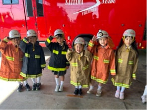 服やヘルメットをつけたり、消防車や救急車の中を見せてもらったりと、