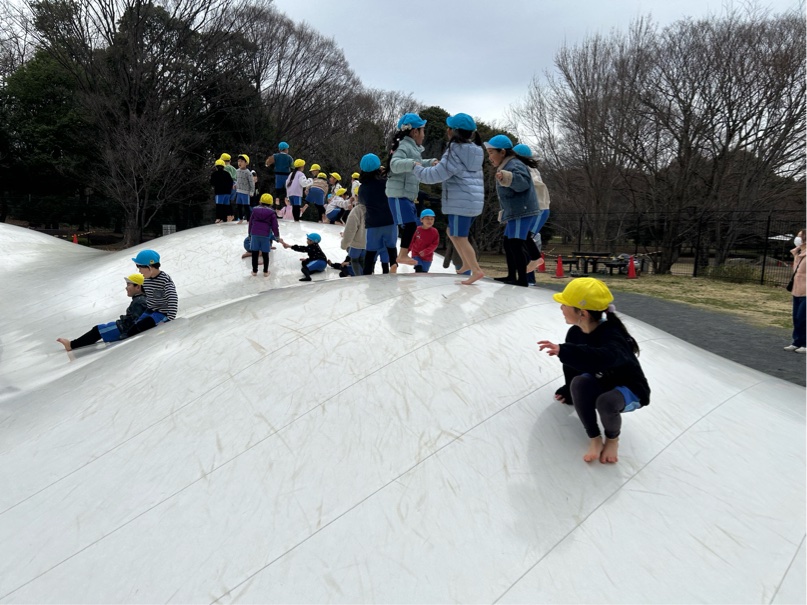公園に着くと、そりの滑り台でたくさん遊びました!